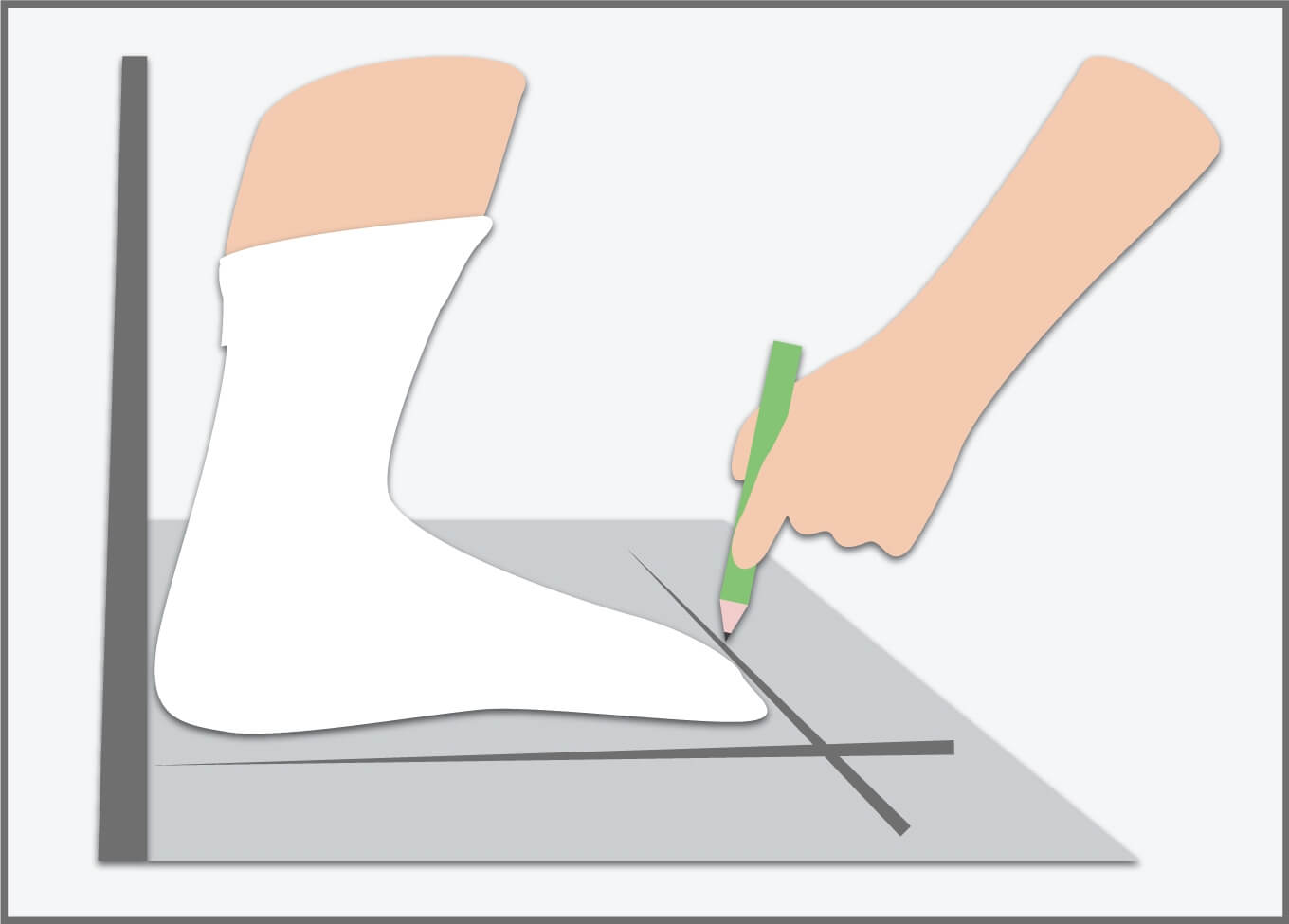 | Dame | Herre | Eksempel på opmåling af skostørrelse Ved hjælp af papir, blyant og måleband måles fodens længde til 24,8 cm. Hertil lægges 0,7 cm i skridttillæg. 24,8 cm + 0,7 cm = 25,5 cm Skostørrelse 39 passer til dette længdemål. |